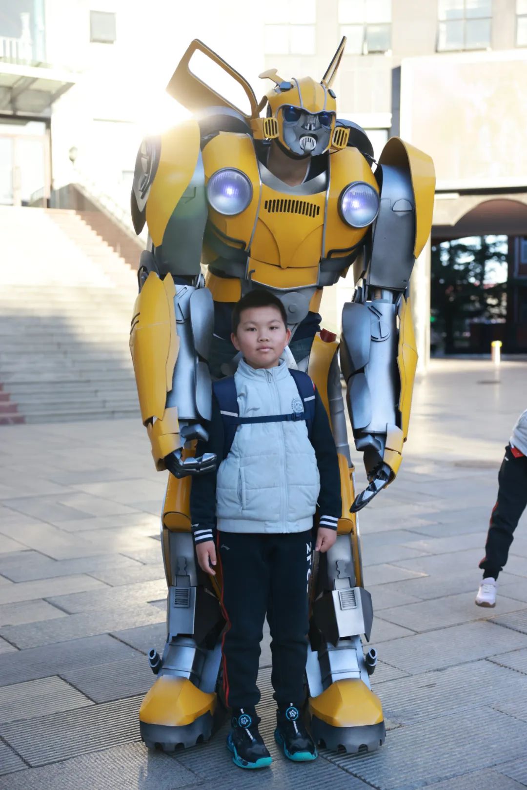 周一早上刚进校园,孩子们就和变形金刚撞了个满怀,科技节的仪式感从进校门起就开始了。