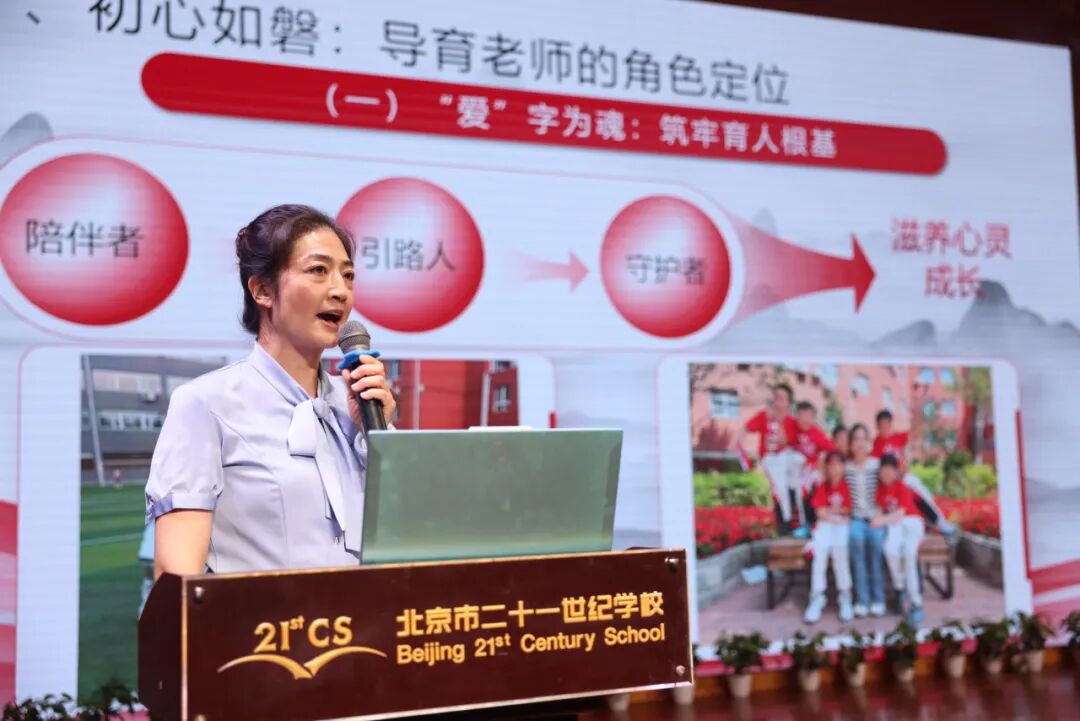 王玮老师是受到学校教育理念吸引,从家长转变为导育老师的,因此王老师比其他人更加熟知导育老师的角色定位,并从四方面讲述导育老师如何胜任学生校园生活的陪伴者、成长引路人与家校沟通桥梁。首先,情字当头、导育老师需要厚植很多超能力量:如鹰眼发现情绪失落、海马体记忆记住过敏原和生日、心理学功底读懂10后的摩斯密码。其次,研字拖底、导育老师需要注重日常关怀:关注孩子衣食住行,第一时间为孩子解决问题。第三,润字潜行、用心浸润童心:比如如何用“三明治法则”做好家校沟通,始终与家长并肩同行,双向奔赴,形成教育合力。最后,爱字贯穿、双向给予温情:且行且思,在成长路上不断实现自我迭代,坚守岗位,未来继续陪伴孩子成长。