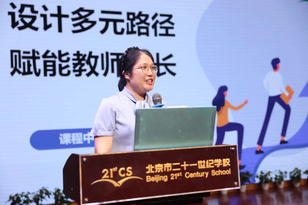 郭茜茜老师说:“上”有学校发展战略的要求,“下”有教师个性化发展的需求,始终是课程中心面临的两大课题。此次演讲郭老师从初心、架构、转变与成效四方面展开分享,让老师们能在更了解课程中心工作的同时,也更熟悉自己在学校的专业成长路径。为赋能教师成长,学校搭建了12条发展路径,包含4个发展目标模块(基础与支持保障、教学实践赋能、研究与创新突破、成果分享传播)和2个支持模块(学校诊断体系、学术积分体系),且路径互通。该路径,全面回应了教师们如何实现“站稳讲台、精进课堂、研究创新、成果辐射”等多层次的个人发展需要,并在学校系统性的支持下,激发教师的无限可能,实现个人与学校共成长的目标。
