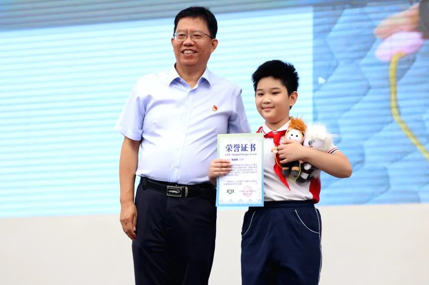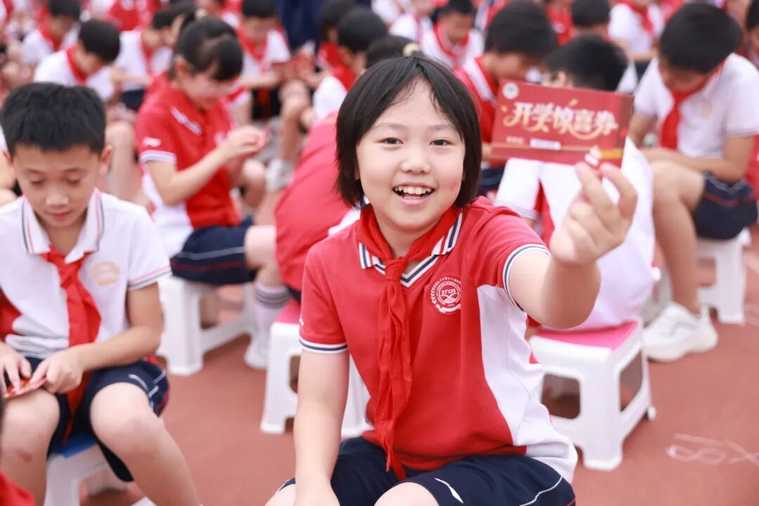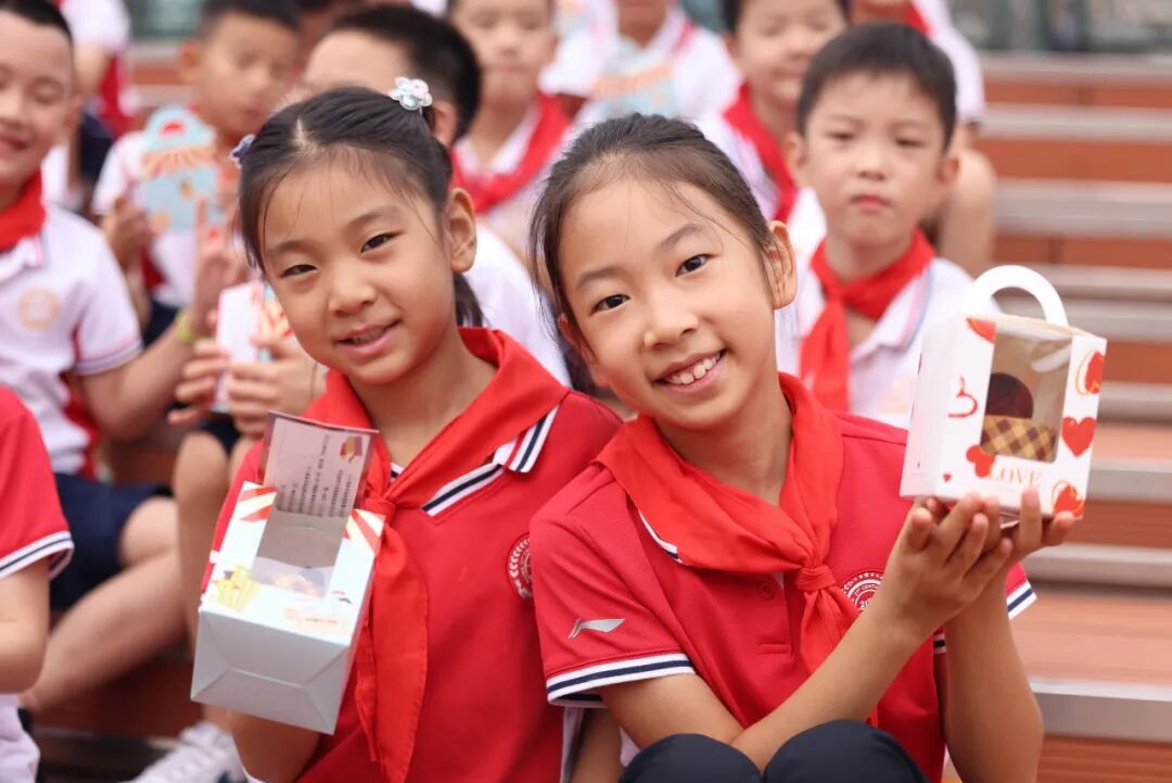 “盲盒4”才是真正的“王炸”——穿着玩偶服的老师推着巨型开学蛋糕缓缓入场,甜甜的蛋糕,满满的祝福,仪式感拉满!小学、初中、高中各一名幸运同学被选中上台,在全场的见证与“开学快乐”的呐喊中,与范胜武校长共同切下开学蛋糕的第一刀。而场下的每个同学也都有一份定制小蛋糕,预示着:“新学期,甜度满分!”