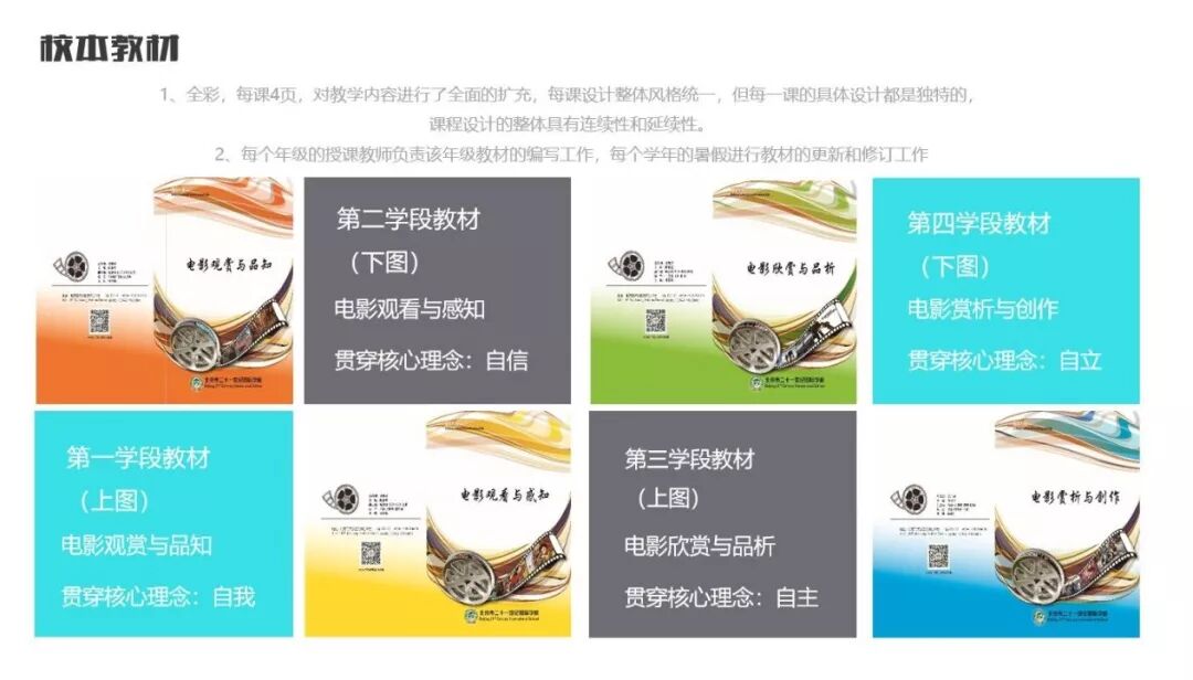 根据学段任务,项目组教师分别编写了《电影观看与感知》《电影观赏与品知》《电影欣赏与品析》《电影赏析与创作》四本校本教材。