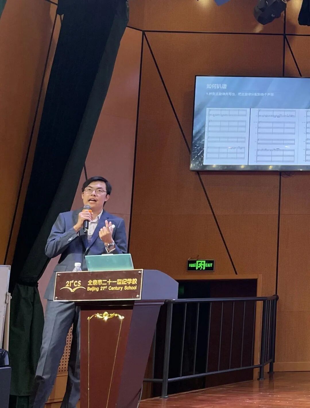 在学生讲堂中,陈诺用自己制作的谱子,介绍了如何在听完一首曲子后,一步步从主旋律、伴奏还原曲谱。他还通过对比《若当来世》的不同改编版本,逐段对比分析,让学生们理解改编曲子的基本原理。
