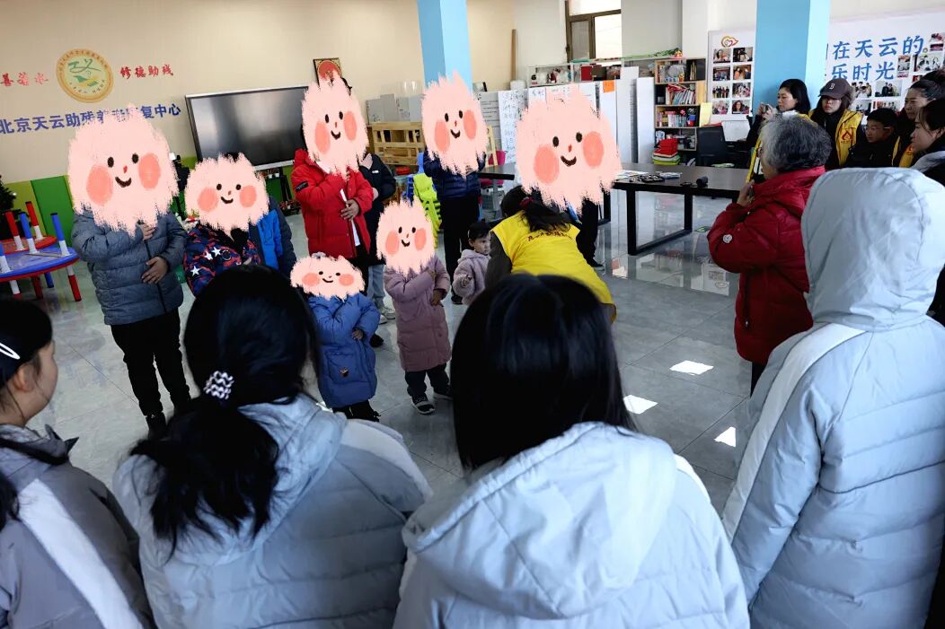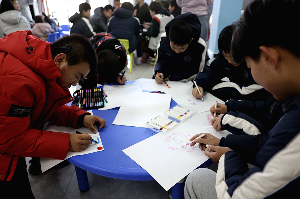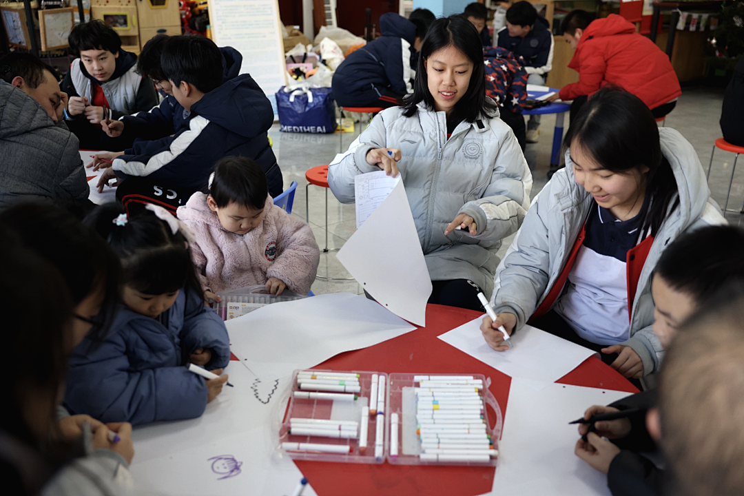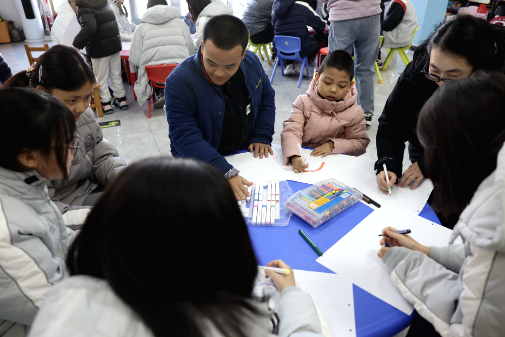 诵读结束后,同学们拿出准备好的彩笔、画纸和手工材料,开始与孩子们共同创作。有的小组一起绘制“心中的太阳”,用明艳的色彩表达温暖;有的合作拼贴图画,在协作中建立默契;还有的耐心教孩子折纸、串珠,尽管动作缓慢,但完成每一件小作品时,孩子们脸上绽放的灿烂笑容,让所有参与的同学感动不已。游戏环节中,简单的互动,更让现场充满了轻松愉快的笑声。