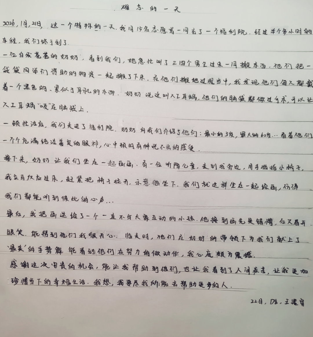 “我陪着一个扎双马尾的小女孩画画,她拿起红色蜡笔,在纸上画了一个大大的太阳,旁边歪歪扭扭地画着两个牵手的小人。我指着画纸上的太阳,给她点了个赞,她似乎看懂了,兴奋地拉着我的手。老师说,这是她在表达开心。那一刻,我忽然觉得,语言从来都不是沟通的唯一桥梁。一个眼神、一次触碰,都能传递最真挚的情感……他们让我明白,我们习以为常的平凡,对有些人而言却是奢望;我们轻易放弃的,却是别人拼尽全力想要抓住的希望。这次经历像一颗种子,在我心里生根发芽。”