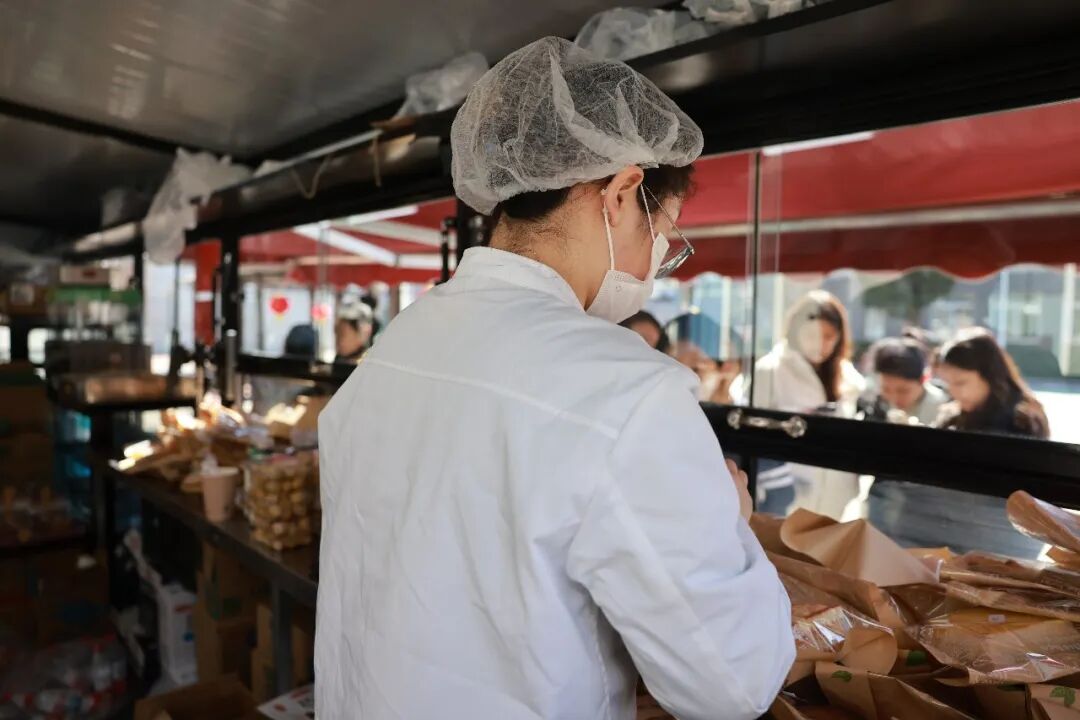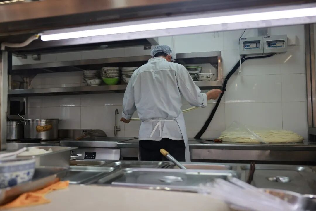 食堂叔叔阿姨的背影,围着热气腾腾的灶台忙碌。